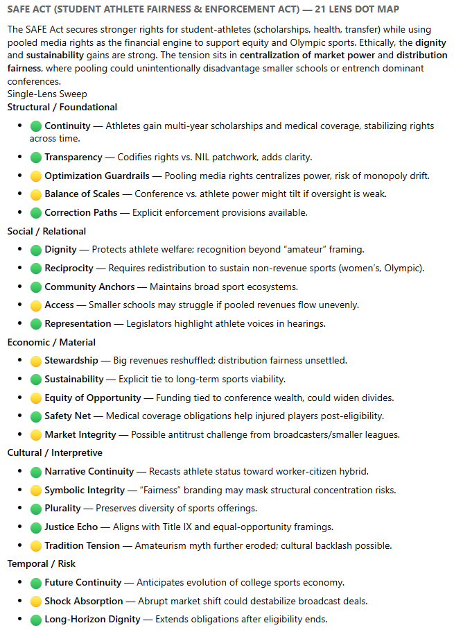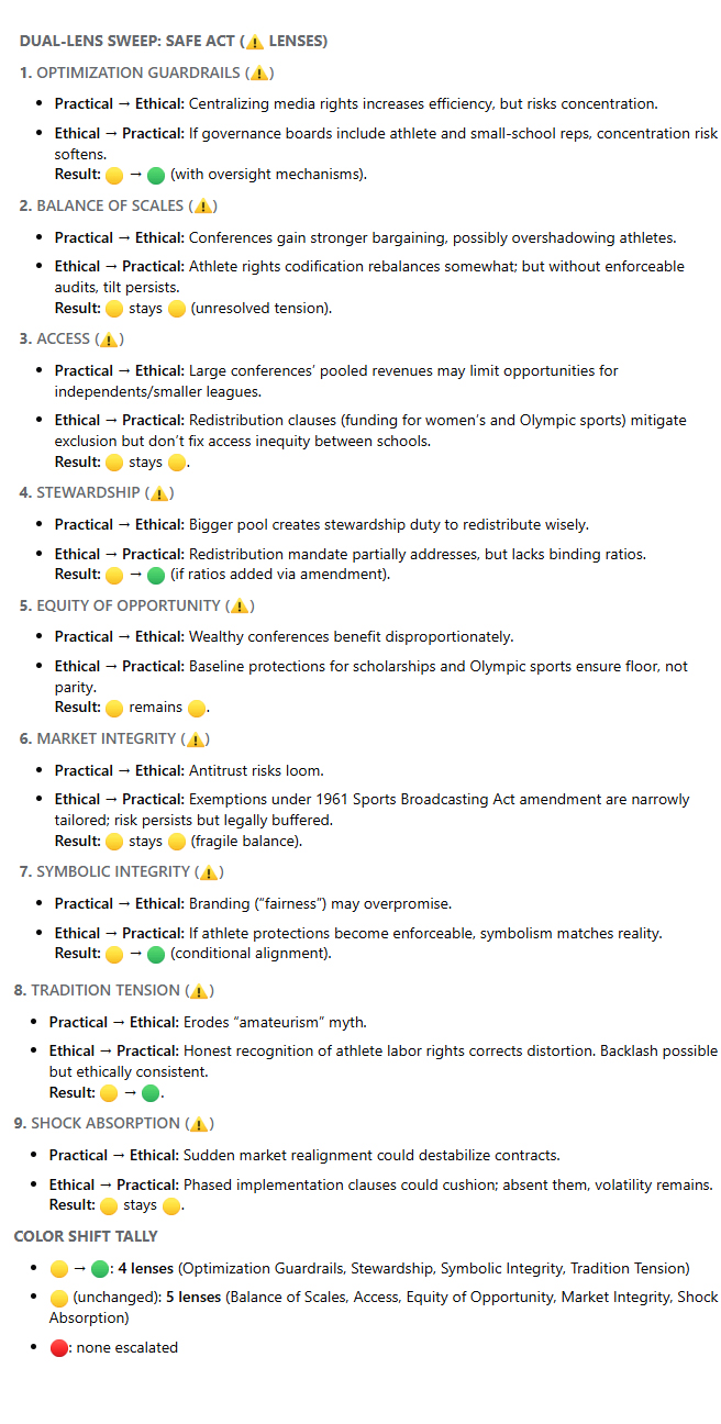 What appears here is the first stage of analysis, not the whole picture. Later steps may combine lenses in pairs or triads to test how principles interact, but the single sweep anchors everything. It is a structured way to balance competing needs while keeping coherence intact. By following this map, the analysis preserves integrity, shows where repair is needed, and builds a record that can be traced openly.