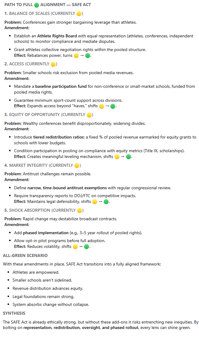 Amendments are crafted to work with the grain of the policy, not against it. Where athletes risk losing bargaining power, the fix is not to scrap the structure but to add a board that balances voices. Where small schools risk exclusion, the solution is a baseline fund that keeps them in play. Each proposal is incremental, targeted, and achievable within existing frameworks.